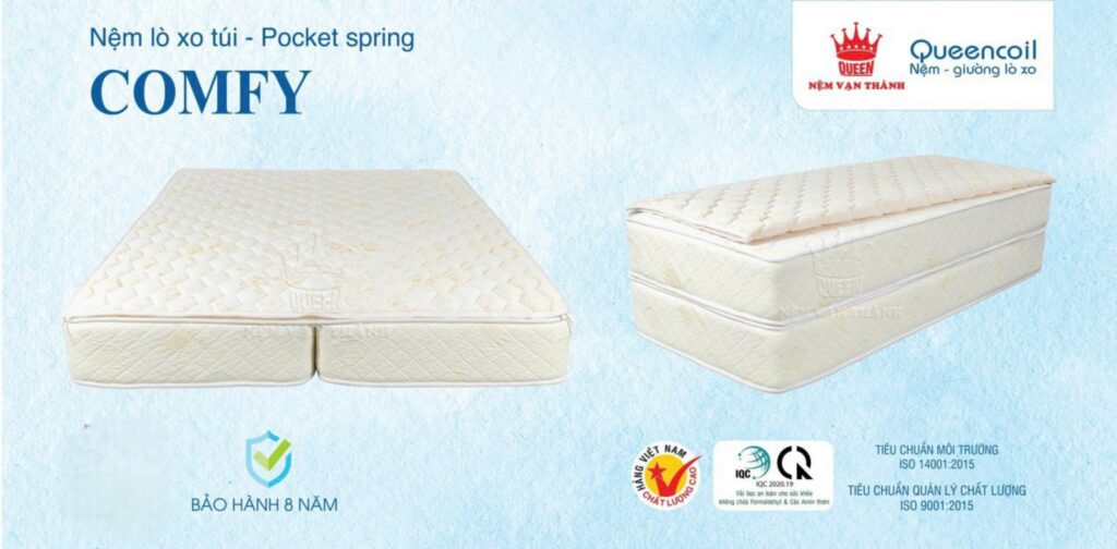 Nệm Lò Xo Comfy là dòng sản phẩm lý tưởng thuộc phân khúc phổ thông của thương hiệu Vạn Thành – dành cho những ai muốn sở hữu một chiếc nệm êm – chắc – thoáng khí với mức giá hợp lý. Sản phẩm được thiết kế theo tiêu chuẩn nâng đỡ khoa học, kết hợp giữa kết cấu lò xo chắc chắn và lớp mousse mềm mại, giúp bạn có được giấc ngủ sâu, thoải mái mỗi đêm.