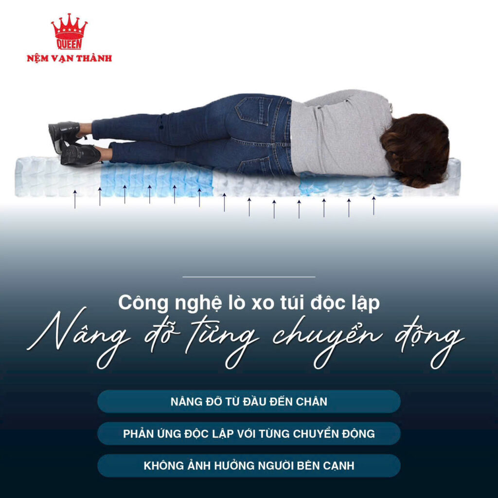 Mỗi con lò xo được đặt trong một túi vải , kết nối chặt chẽ với nhau tạo thành khung nâng đỡ đồng đều toàn thân, giữ cho cột sống luôn ở trạng thái tự nhiên khi ngủ.