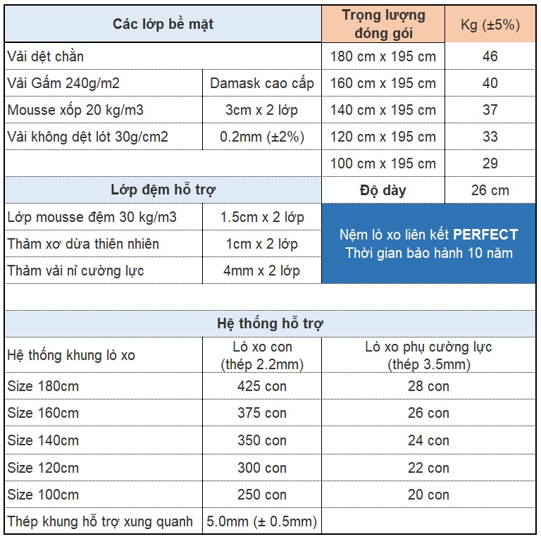 | Lò xo liên kết chắc chắn | Đỡ toàn thân – không xẹp – dùng bền đến 10 năm |