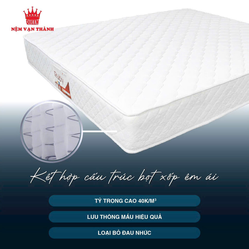 - Độ bền cao: Nệm Lò Xo Túi Ruby có độ bền vượt trội, không bị lún hay biến dạng sau thời gian dài sử dụng, đảm bảo sự đầu tư lâu dài và tiết kiệm chi phí cho gia đình.